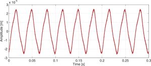 Fig 3. Time history of the vertical displacement of the free end of the tube, excited by a sinusoïdal extension of the actuators, with an amplitude of 30 μm and a frequency of 30 Hz.